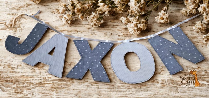 Charming, handcrafted decoration featuring individually stitched fabric letters—each one padded and patterned to create a soft, textured look. Perfect for names, messages, or special occasions, it adds a personal and cosy touch to nurseries, parties, or home décor.